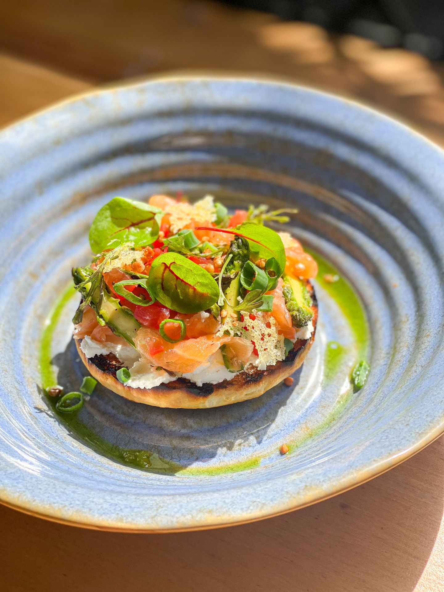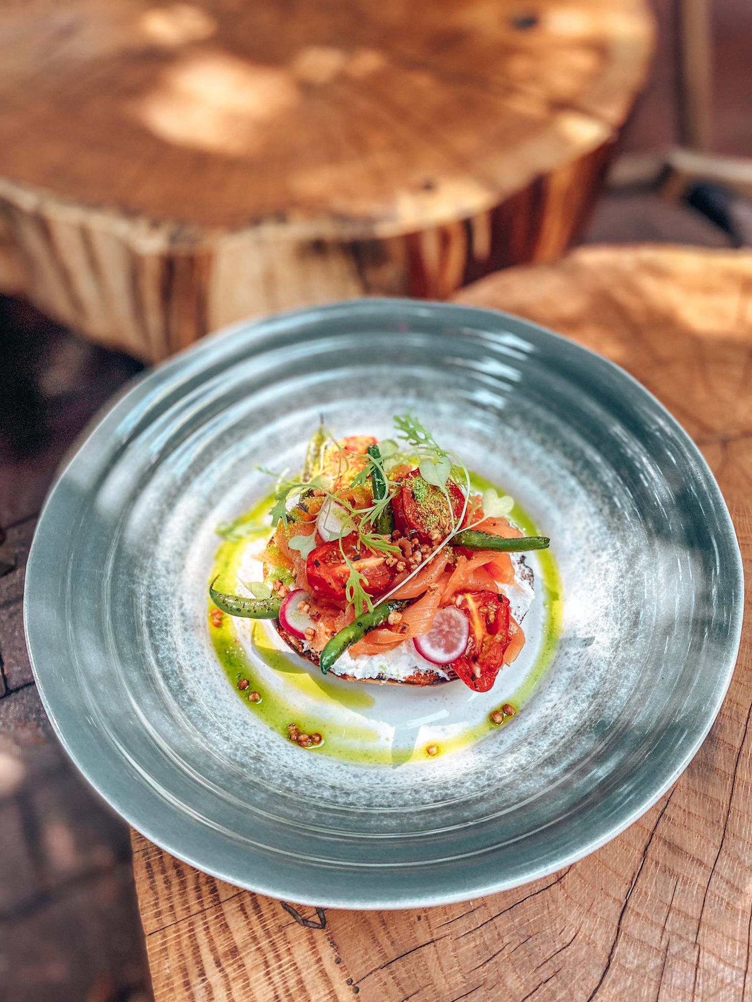 Podawany na maślanej bułeczce, z serkiem śmietankowym, konfitowanymi pomidorkami i fasolką szparagową.